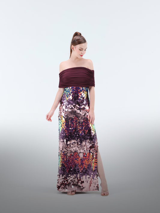 A statement piece crafted from Purple Moonlight Lycra, featuring a sleek bodycon fit. The ruffled bodice adds playfulness, while ruching at the hem and a flared waist strap enhance the silhouette. Fabric: Purple Moonlight Lycra Details: Ruffled bodice & ruching at hem Fit: Bodycon...