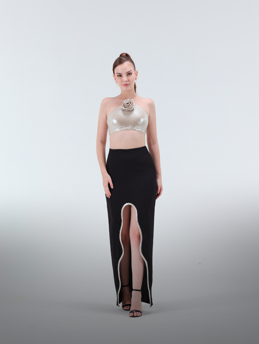 A true showstopper, this fitted bodycon dress blends green banana crepe with pink Armani satin, creating a striking contrast. The highlight of the design is the handmade satin ruffled flower on the front, adding an elegant yet dramatic flair, making it the perfect choice...