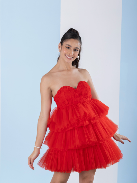 An enchanting statement piece in red that merges couture craftsmanship with playful elegance. The strapless sweetheart neckline exudes timeless allure, while the intricately woven tulle bodice reflects artisanal craftsmanship at its finest. Layers of delicately structured tulle cascade in tiered perfection, lending sculptural drama...