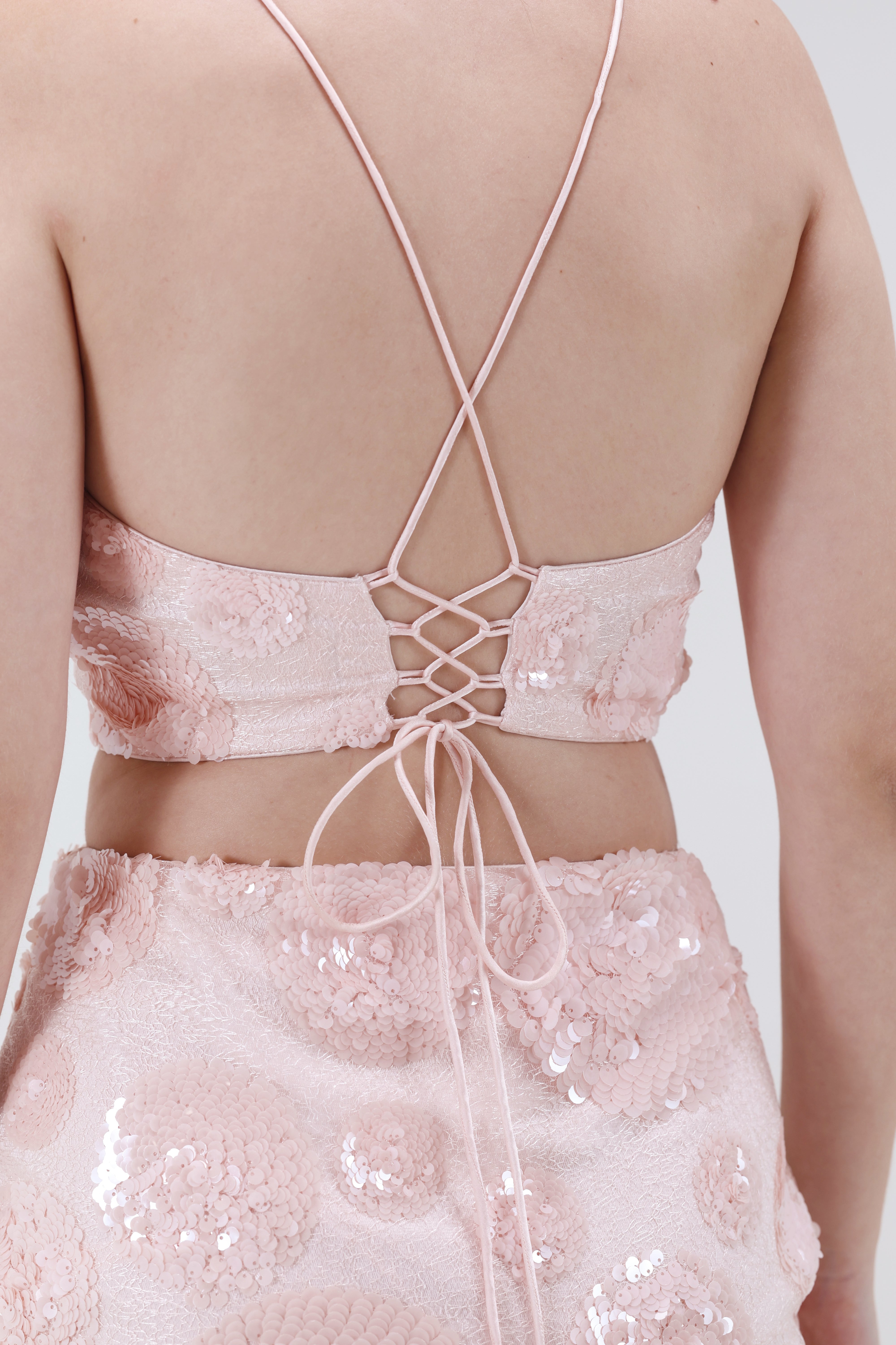 Gorgeous baby pink mini skirt and crop top set, crafted from delicate mesh fabric adorned with floral sequins. The crop top features a criss-cross tie-up back, adding a flirty and adjustable detail that enhances the silhouette. The high-waisted mini skirt hugs the curves beautifully, offering a flattering, body-enhancing fit that's both playful and feminine.