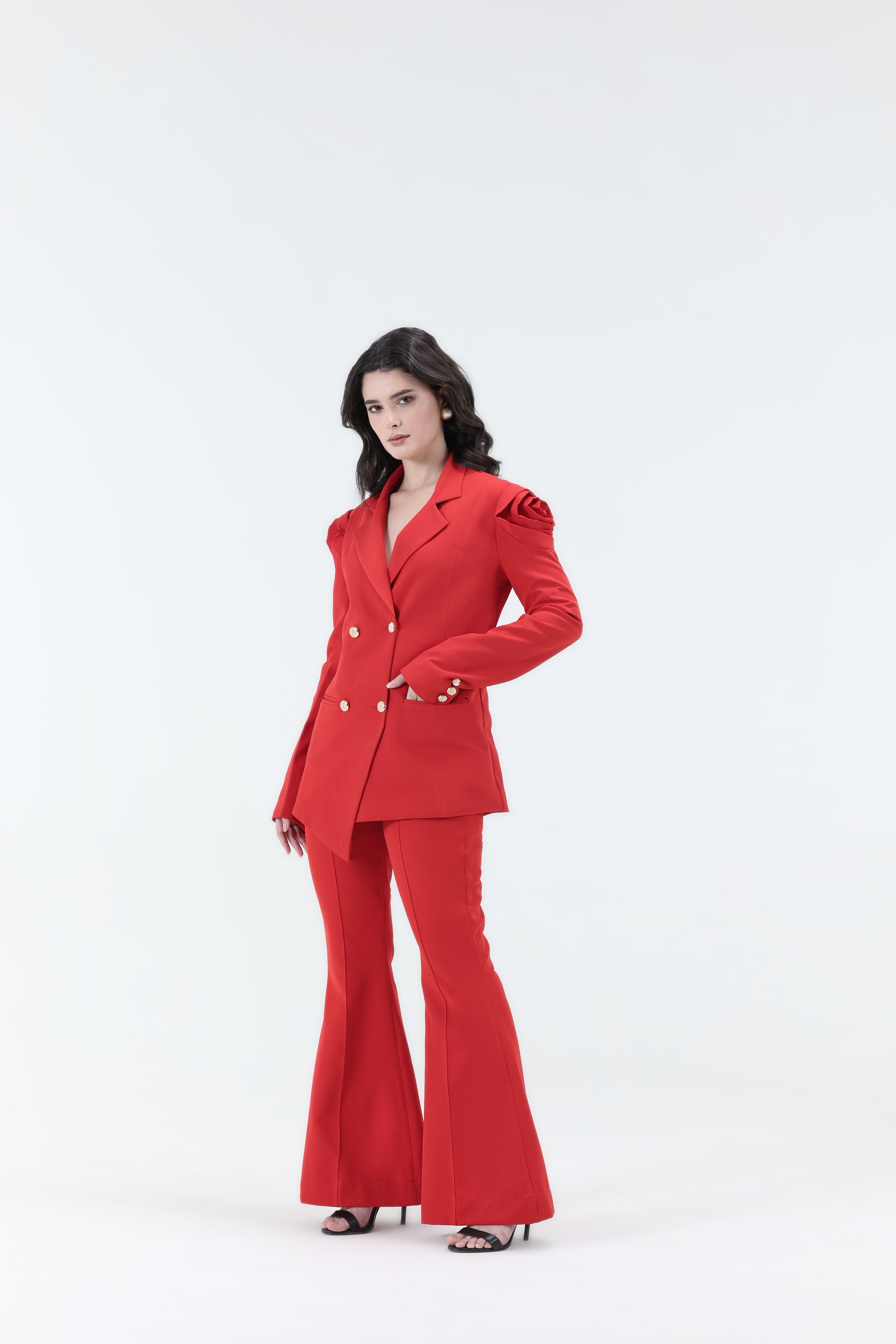 A chic fitted blazer in red banana crepe, featuring a floral shoulder element and gold textured buttons for a refined touch. Perfect for formal and casual styling.