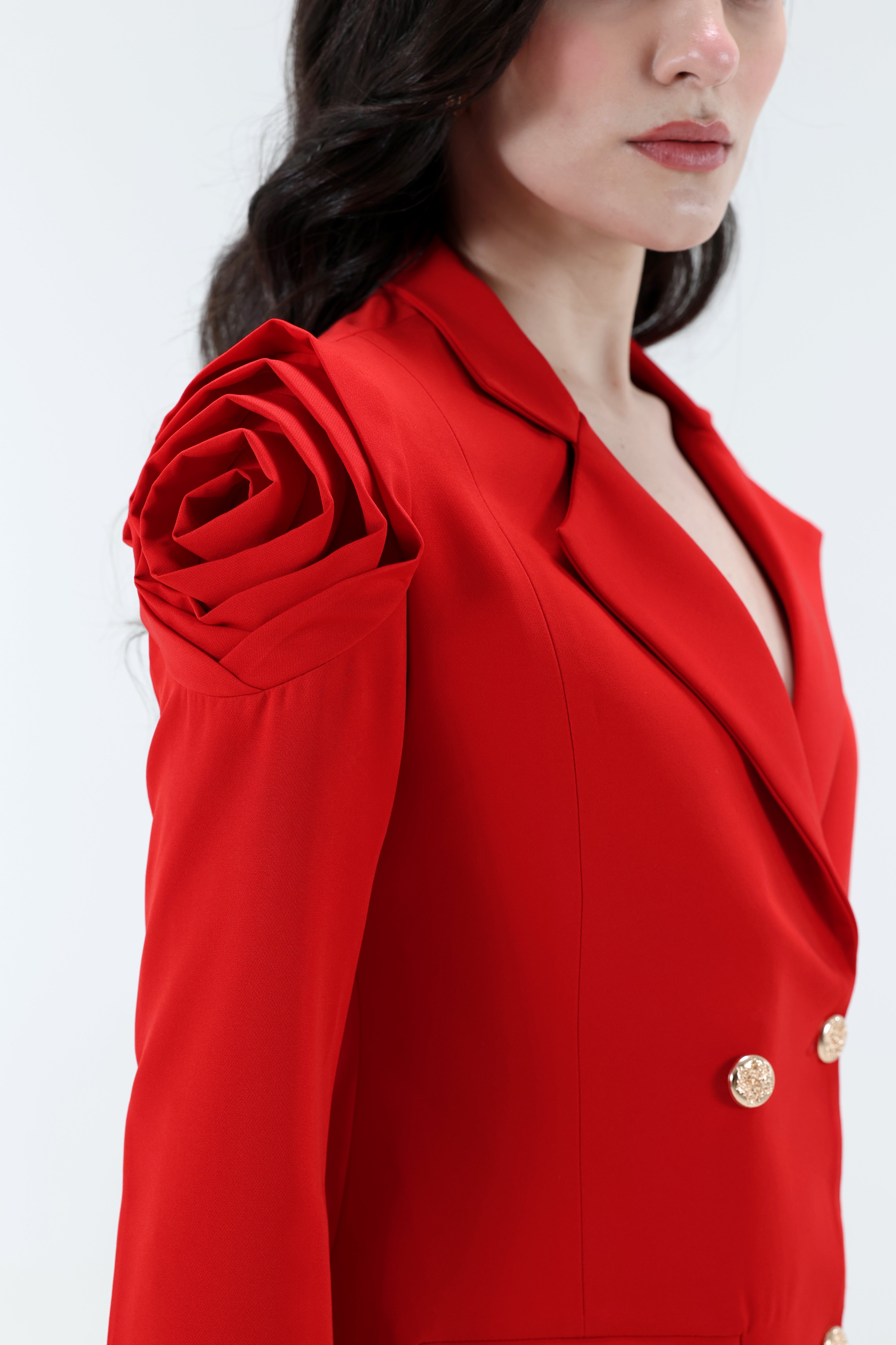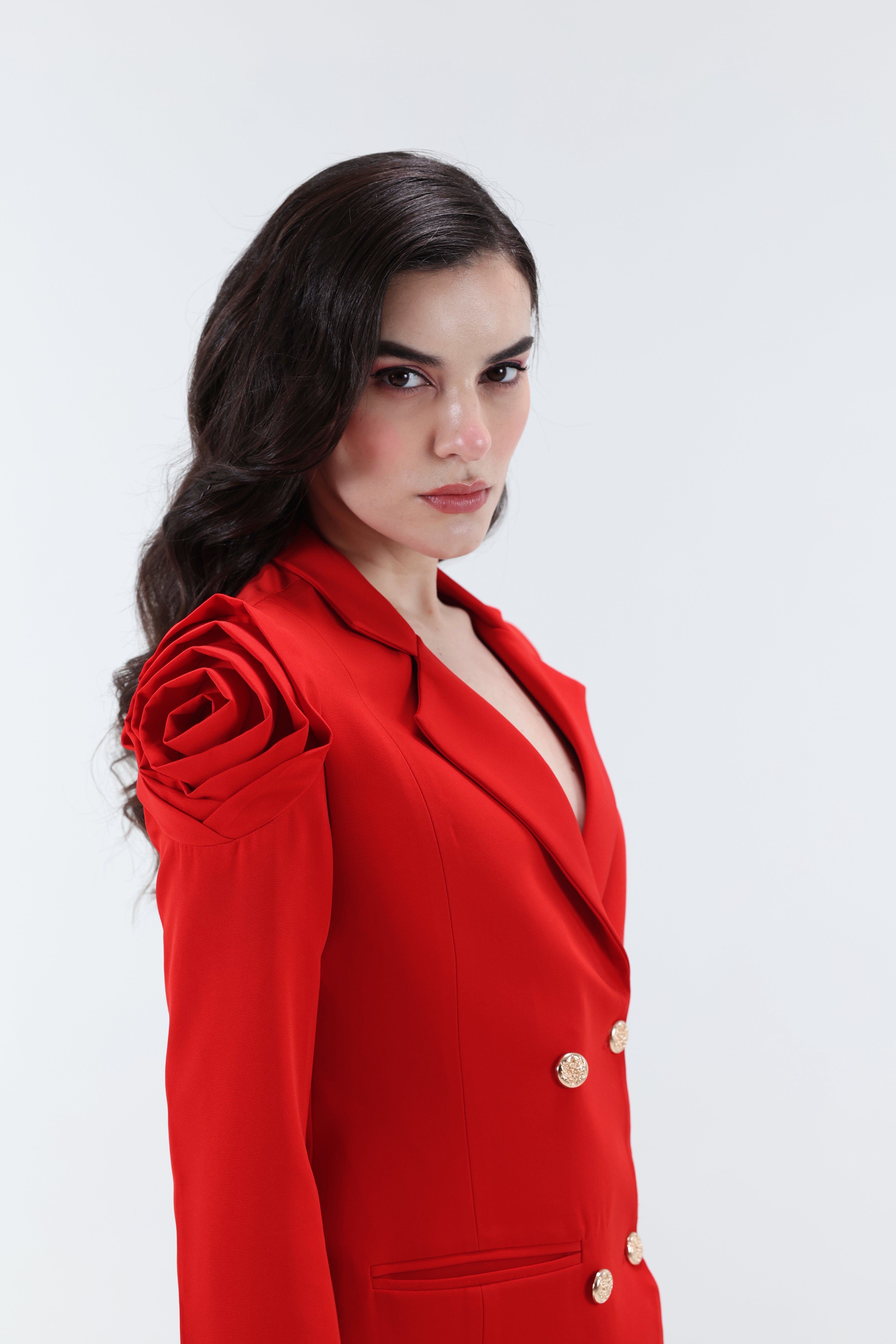 A bold fusion of power and romance, this red banana crepe bodycon dress features delicate floral detailing on the shoulder, adding a feminine touch to its structured silhouette. Gold textured buttons with intricate engravings enhance its luxe appeal, making it a head-turning choice for both formal and evening occasions.