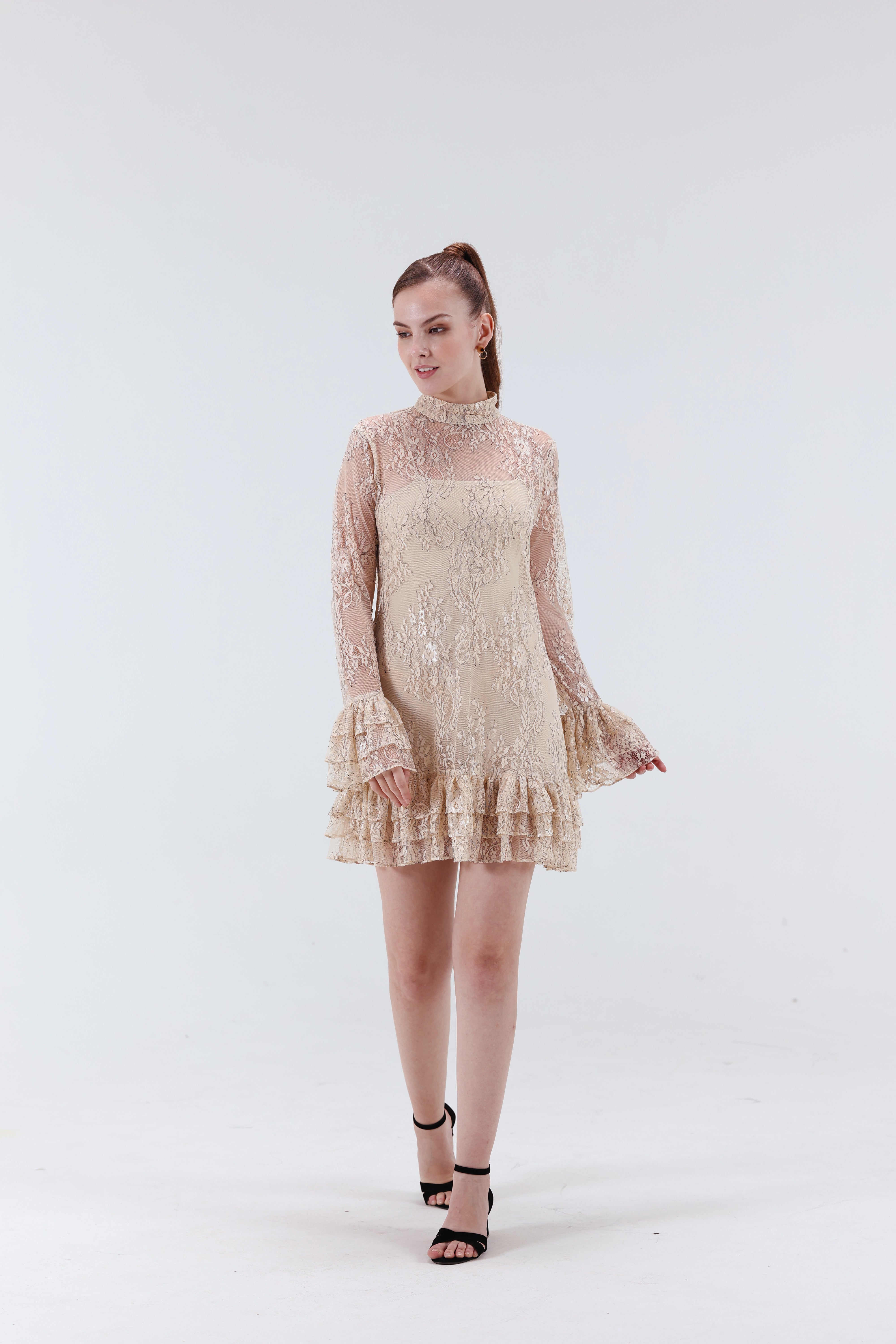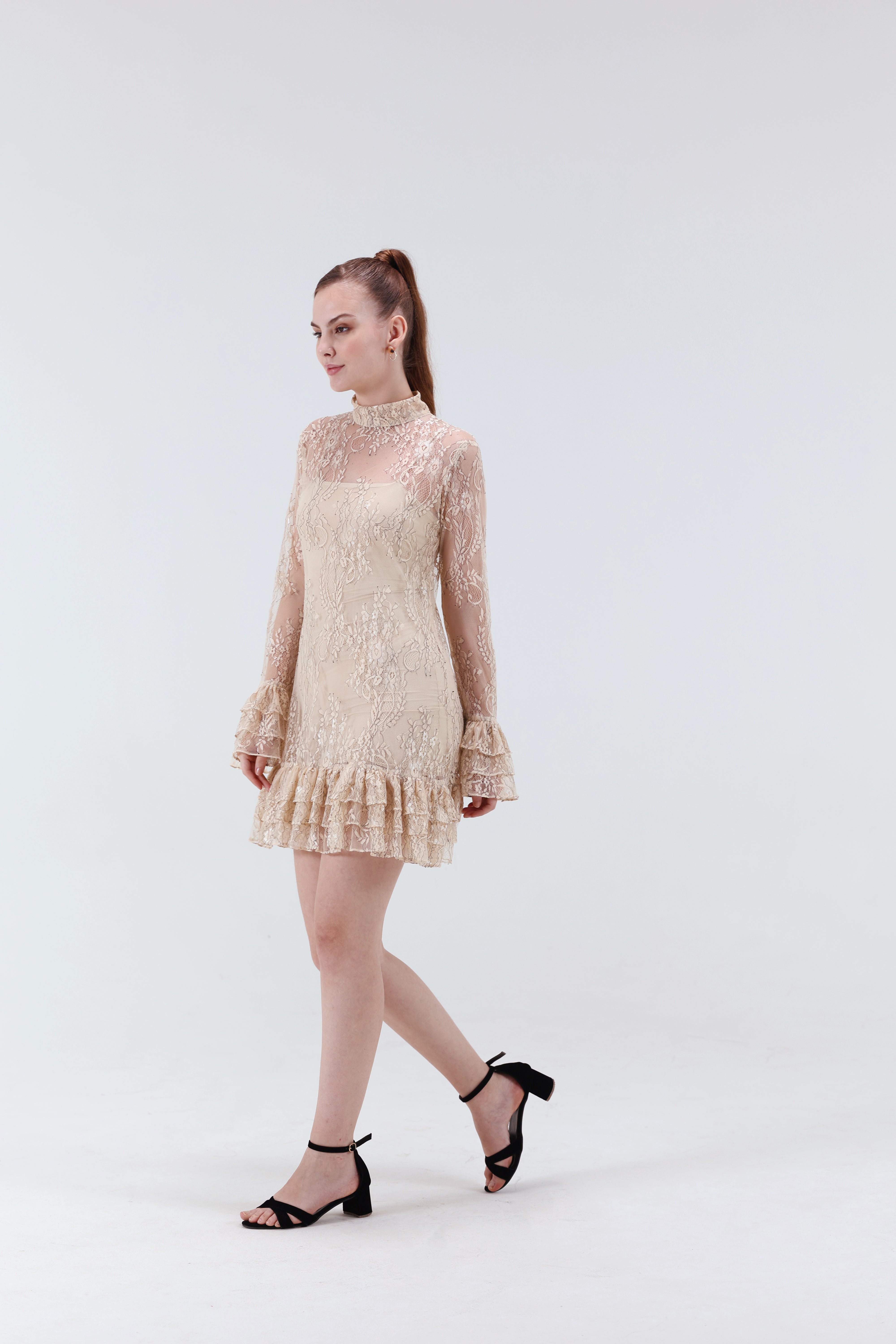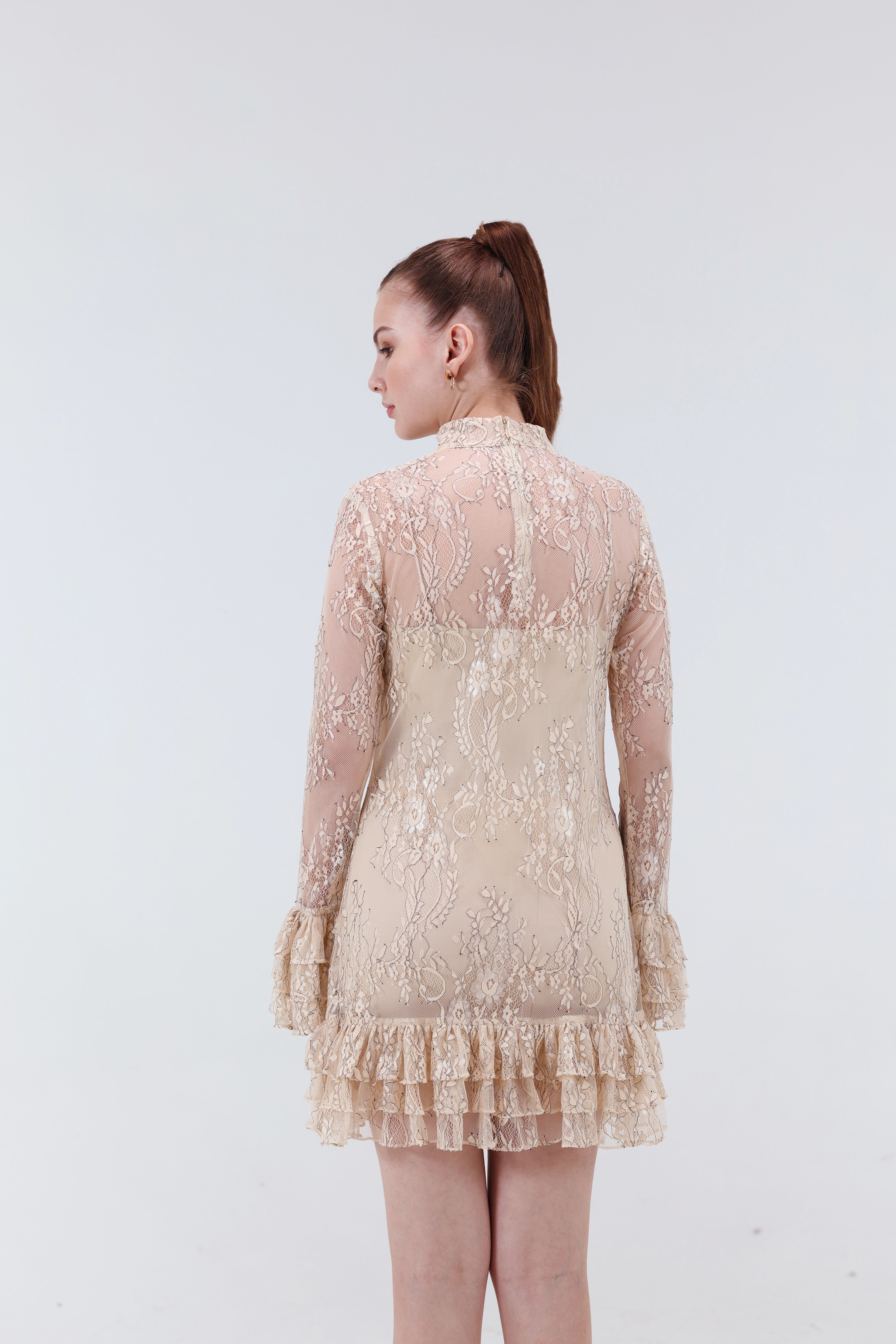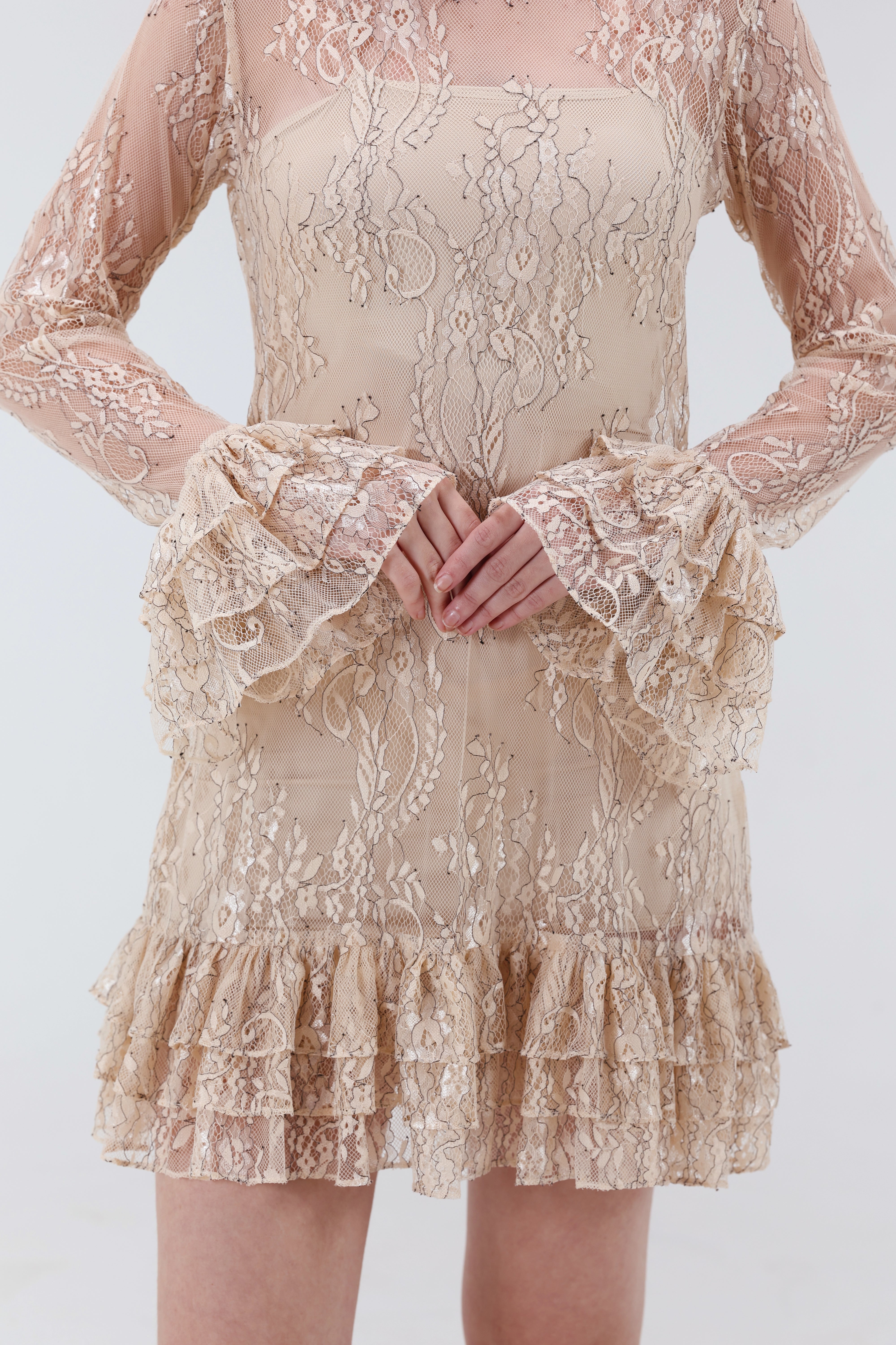 Crafted from intricate champagne-beige lace, this mini dress features sheer long sleeves with dramatic bell cuffs, evoking a whisper of romantic nostalgia. It is an embodiment of vintage elegance reimagined for the modern woman. The tiered lace hemline enhances movement with a soft, flirtatious charm, while the high neckline adds balance and sophistication.