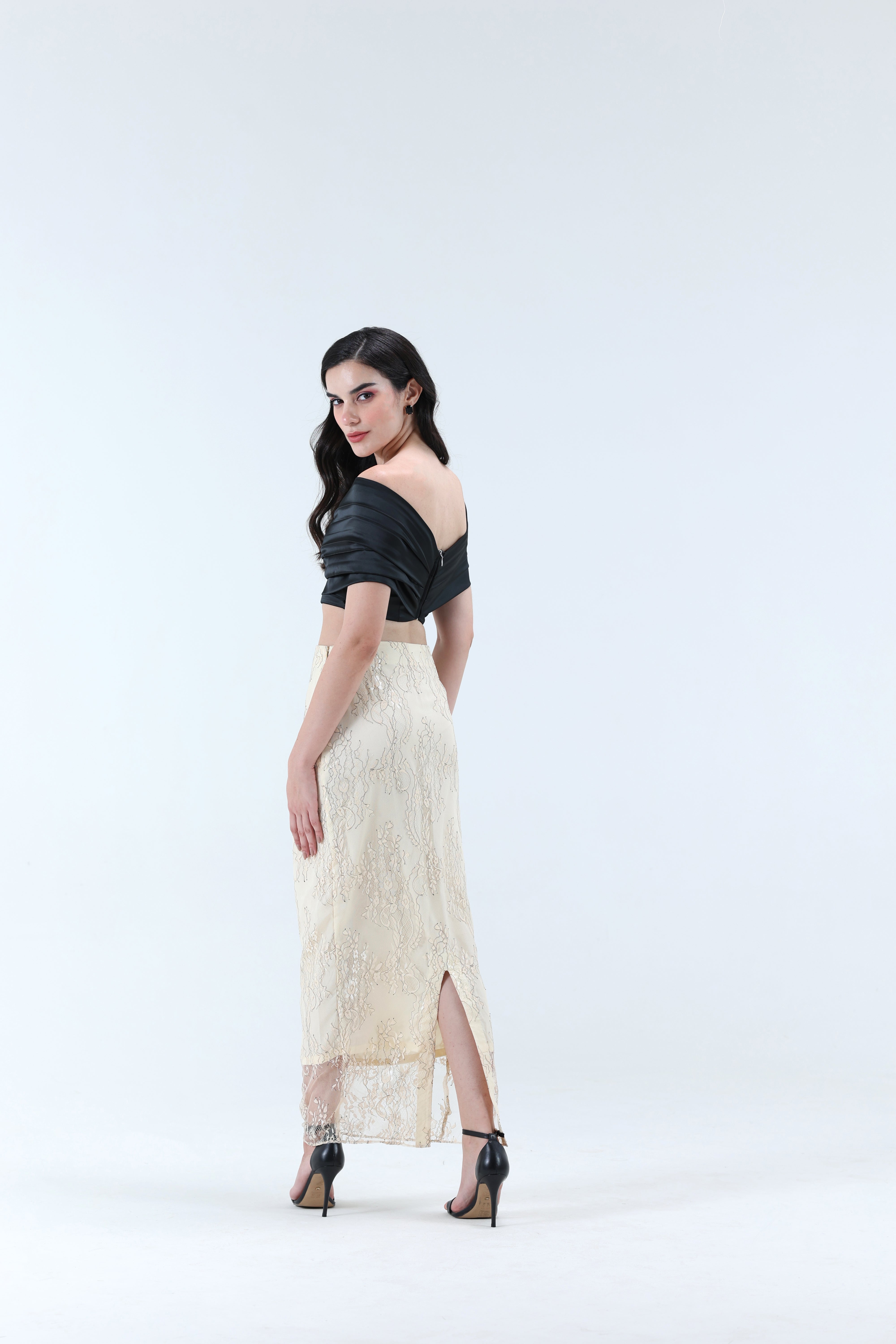 A timeless yet bold coord set that blends sophistication with statement style. The high-waisted vintage-inspired lace skirt is crafted in delicate cream lace with intricate detailing and a subtle net lining for added volume and structure. Paired with a pleated off-shoulder wrap top featuring elegant texturing and a sleek silver zipper closure, this look balances femininity with modern edge. Perfect for evening occasions or refined daywear.
