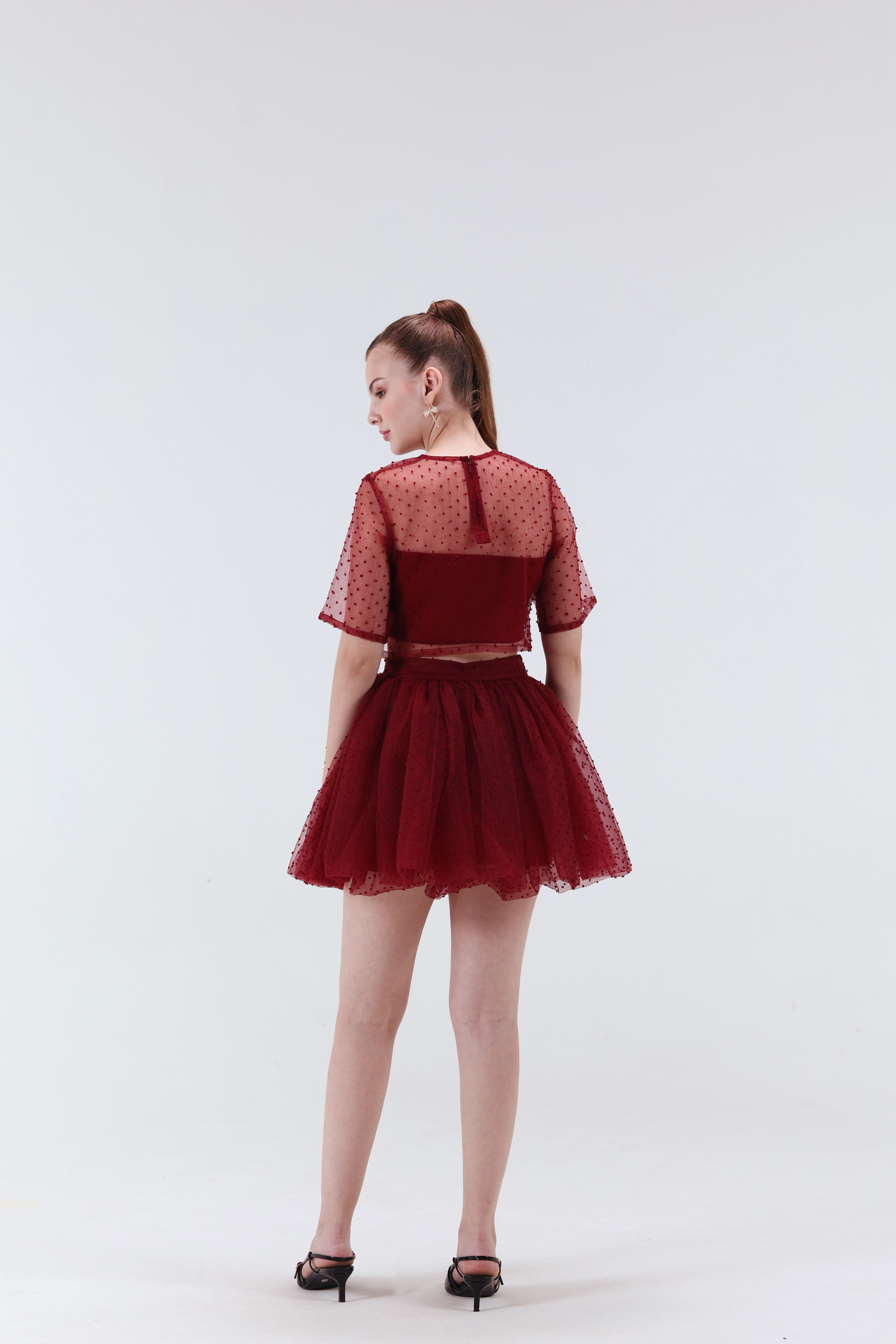 It is a high-waisted, voluminous mesh skirt in a matching burgundy shade. Made from the same textured dobby mesh fabric, it offers a cohesive look when paired with the top. The gathered waistband creates a full, flared silhouette, adding graceful movement and a romantic touch.