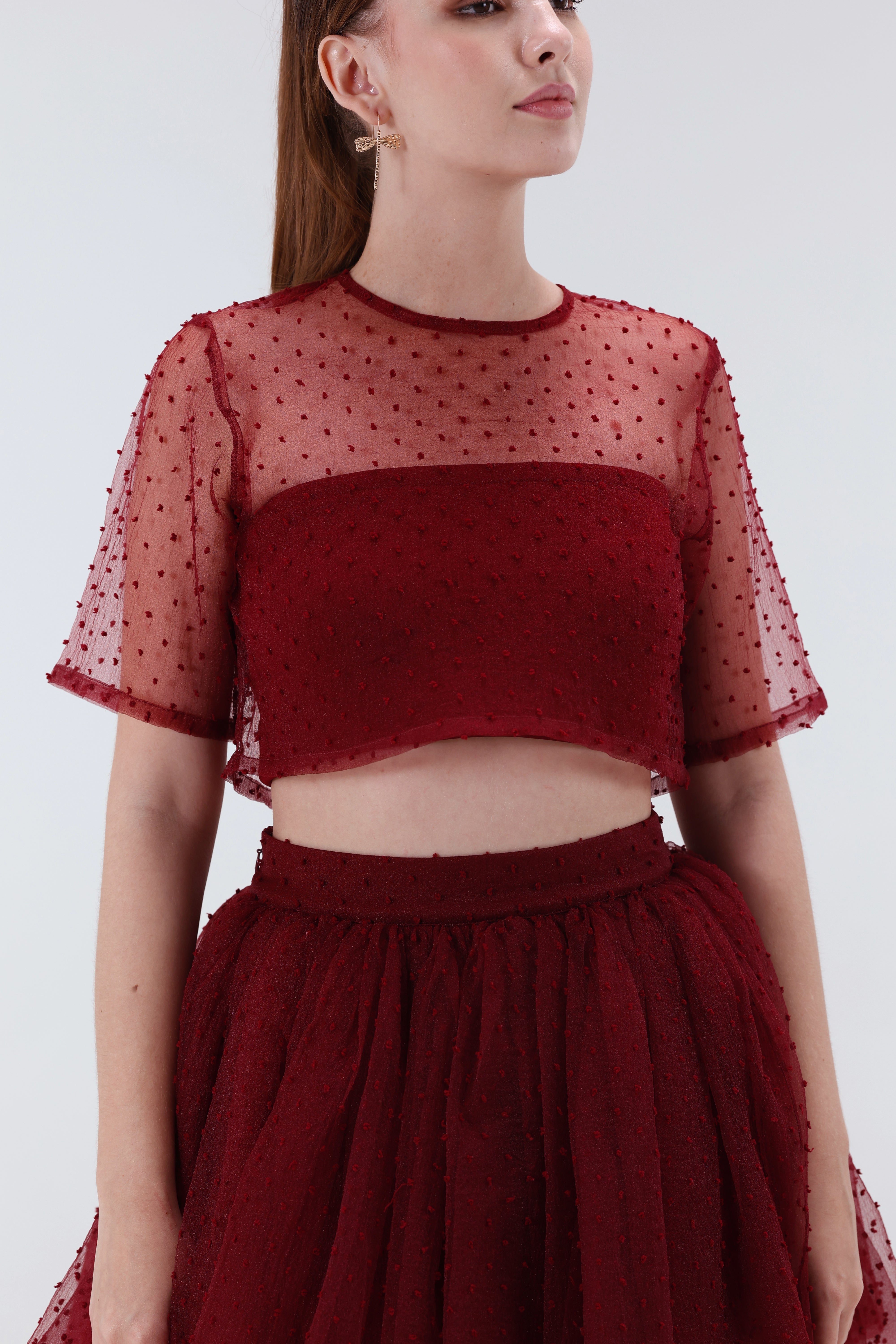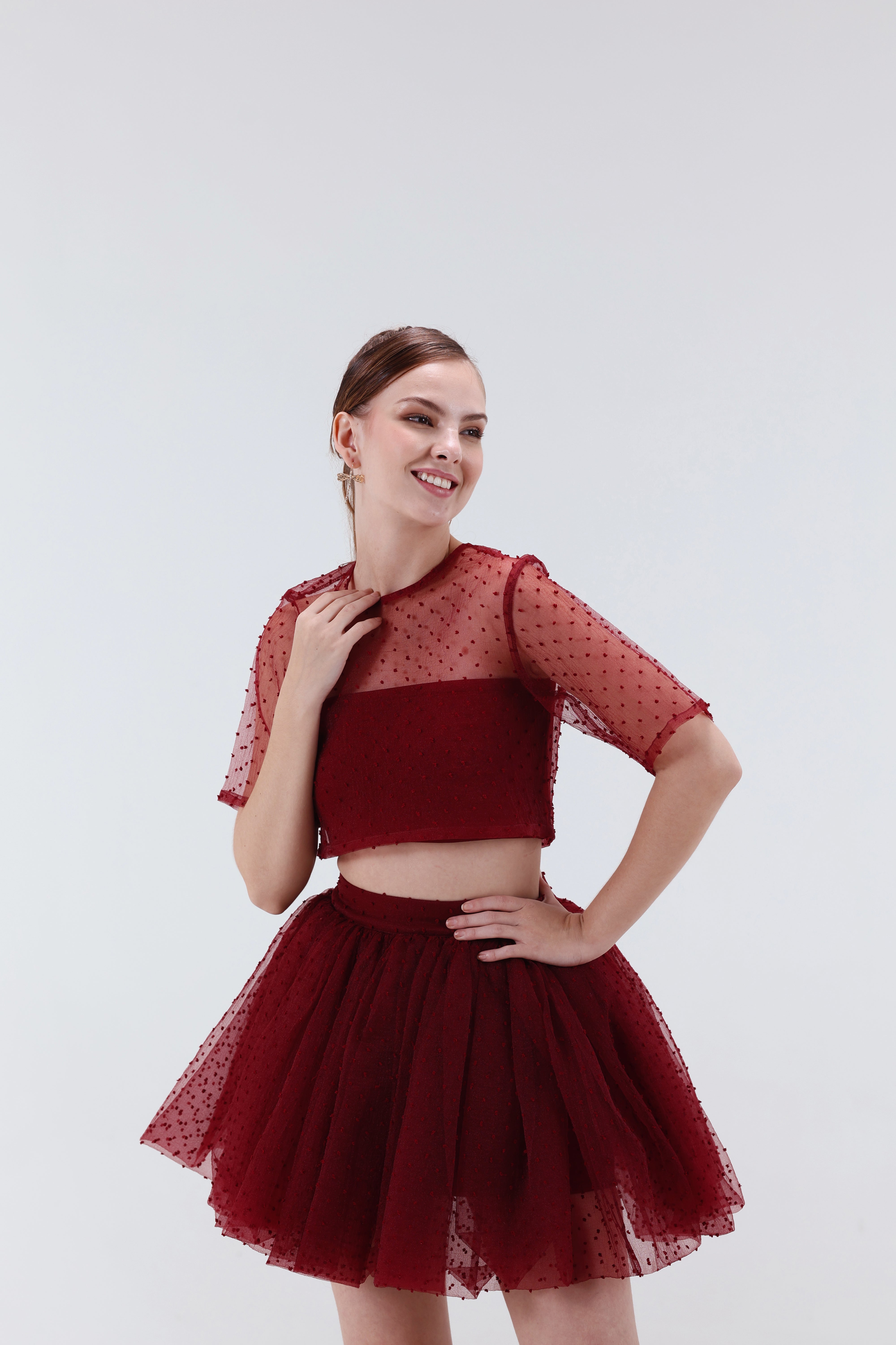 The organza ensemble redefines playful elegance with its flirtatious silhouette and modern charm. Crafted in rich burgundy, this two-piece creation features a sheer polka-dot mesh overlay with a cropped bodice, paired with a voluminous skirt that sways with every step.