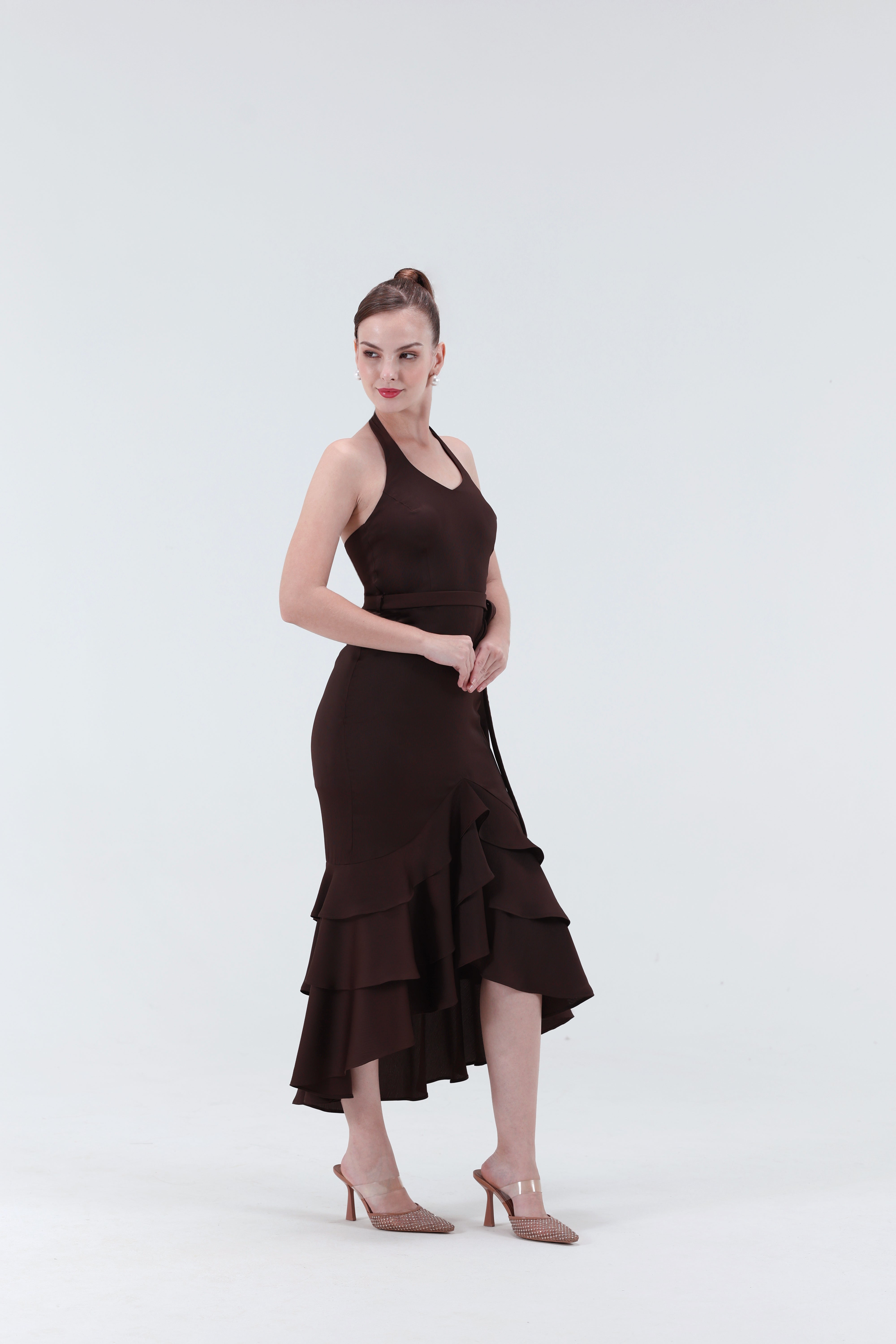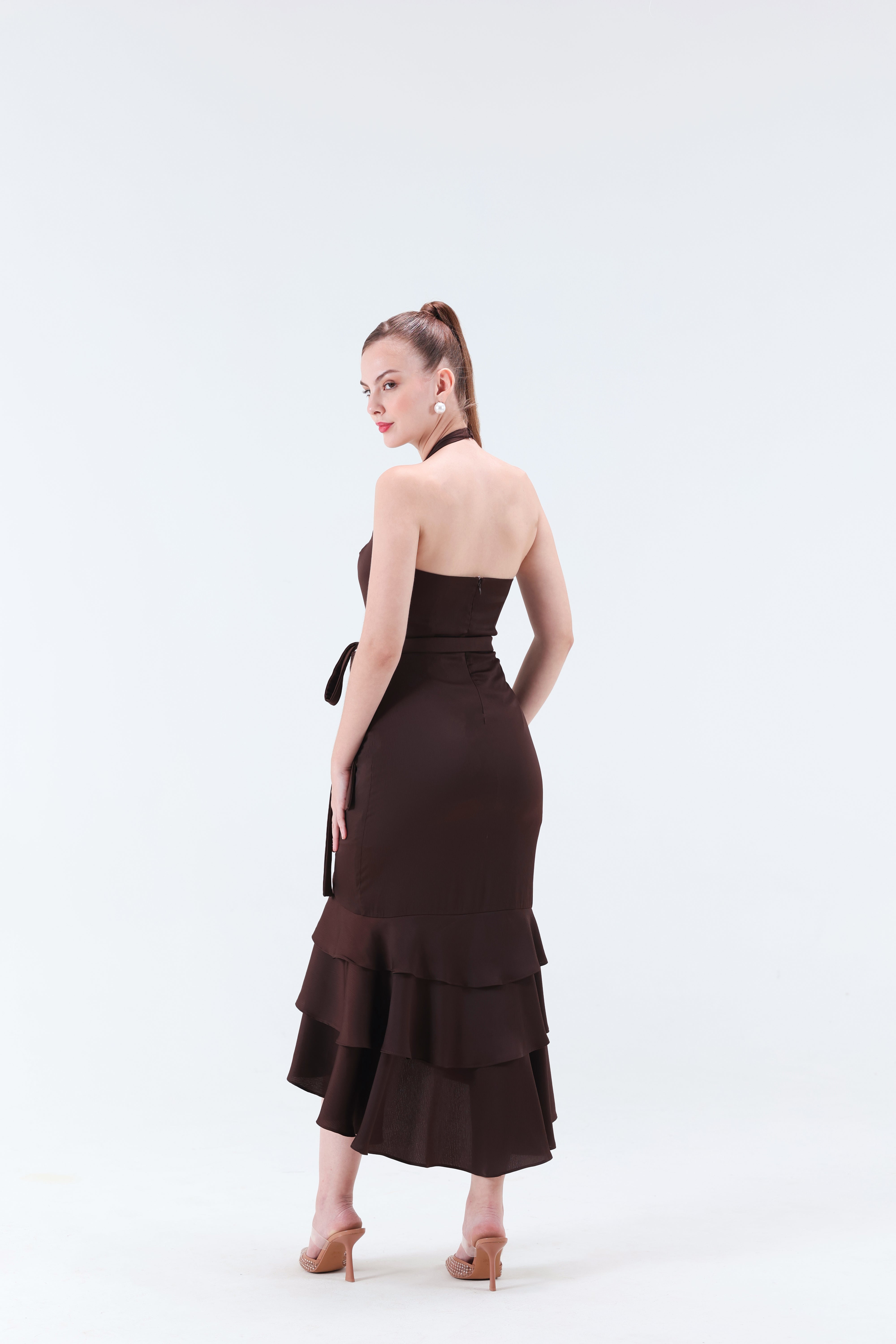 Timeless and sophisticated, this deep cacao brown one-piece dress features a chic halter neckline and graceful 3-tier ruffles at the bottom.