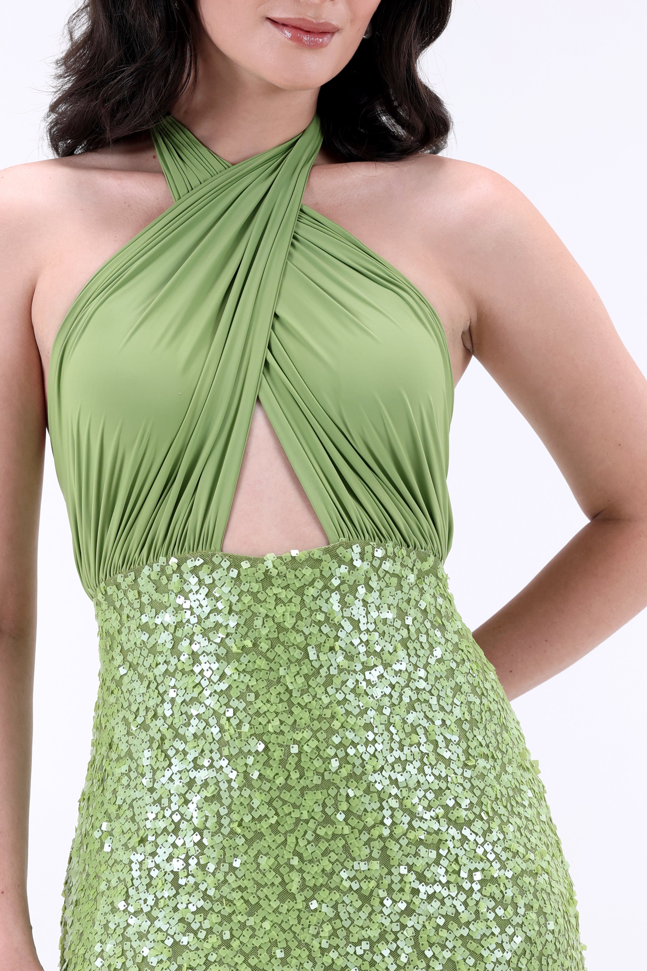 Make a bold statement with the Eloise sequins gown, designed for effortless elegance. Crafted from stretchable nylon lycra with a body-fitted silhouette, it features a cross tie-up neckline that enhances its sophisticated backless design. A show-stopping piece for any glamorous occasion.