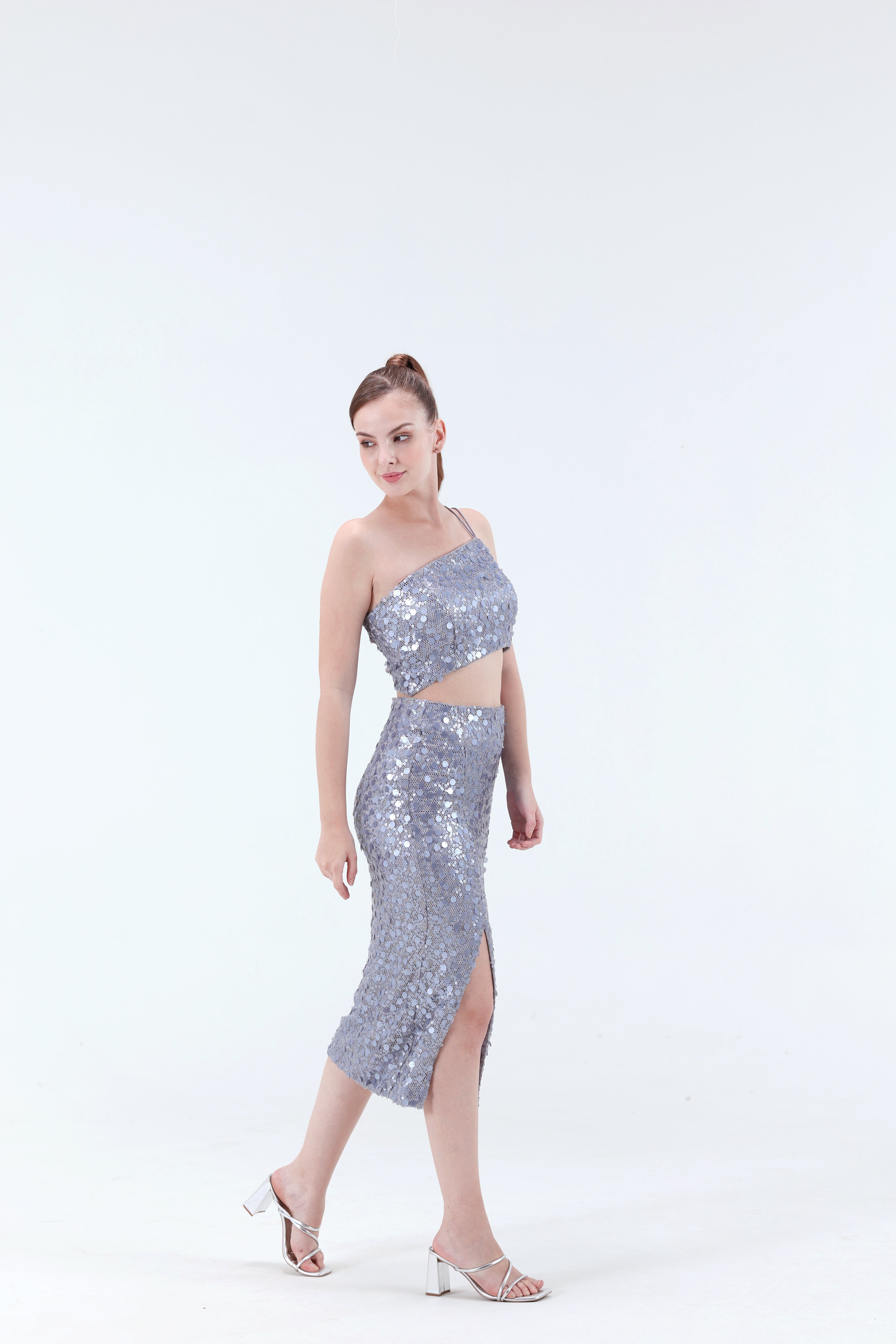 Asymmetrical Sequin Crop Top – a statement-making piece crafted in shimmering grey sequins, featuring an asymmetrical neckline with delicate dual straps and a chic cropped silhouette for a modern, glamorous edge.