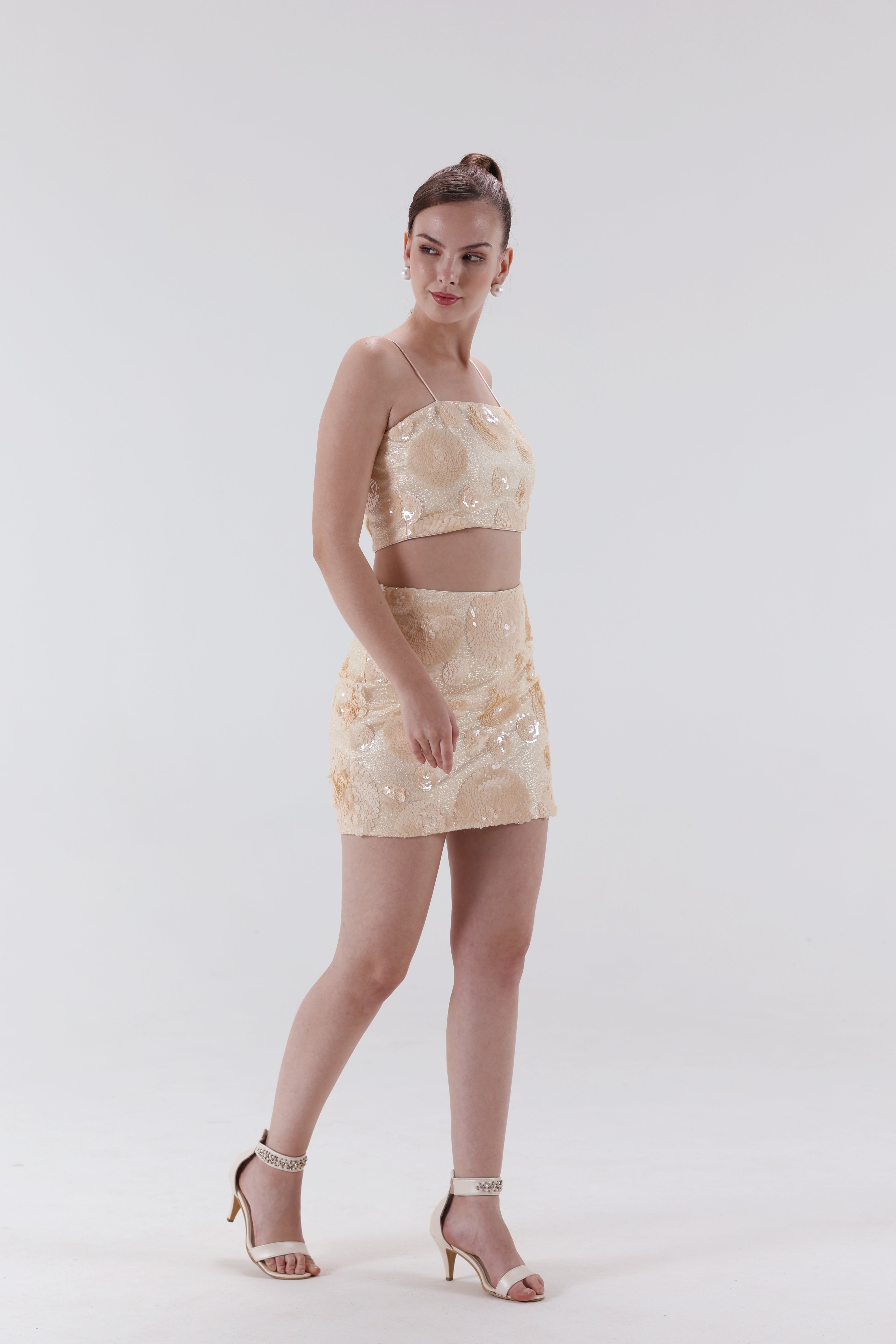 This champagne beige crop top features delicate spaghetti straps and circular floral sequin embellishments for a textured, elegant finish. The subtle shimmer and minimalist silhouette shines out completely.
