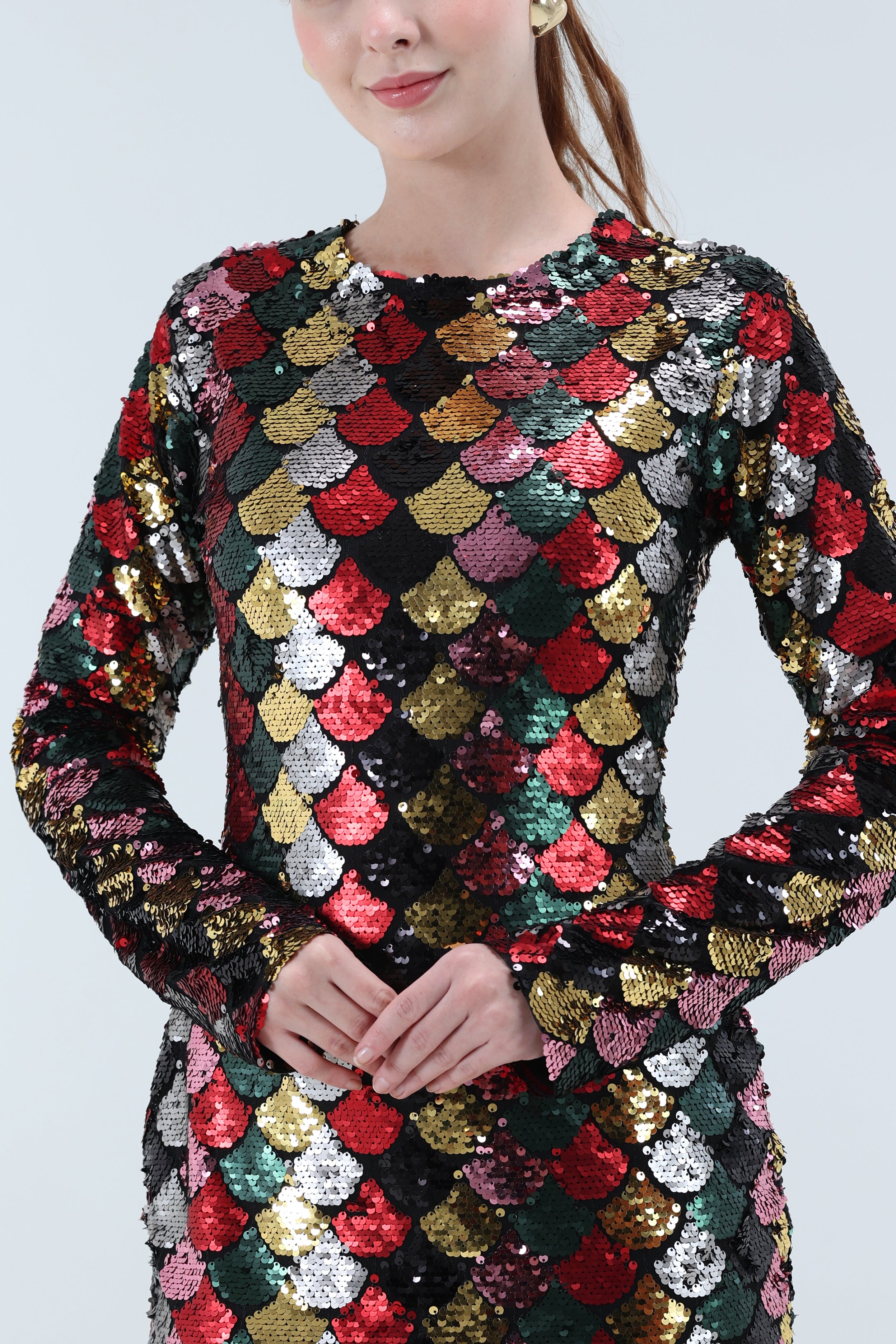 The Luce Mini is a dazzling blend of artistry and sophistication. Designed with intricately arranged multicolor shell sequins, it exudes a radiant charm. The stretchable lycra base ensures a perfect fit, while the center back cutout with hook-eye closure adds a touch of allure.