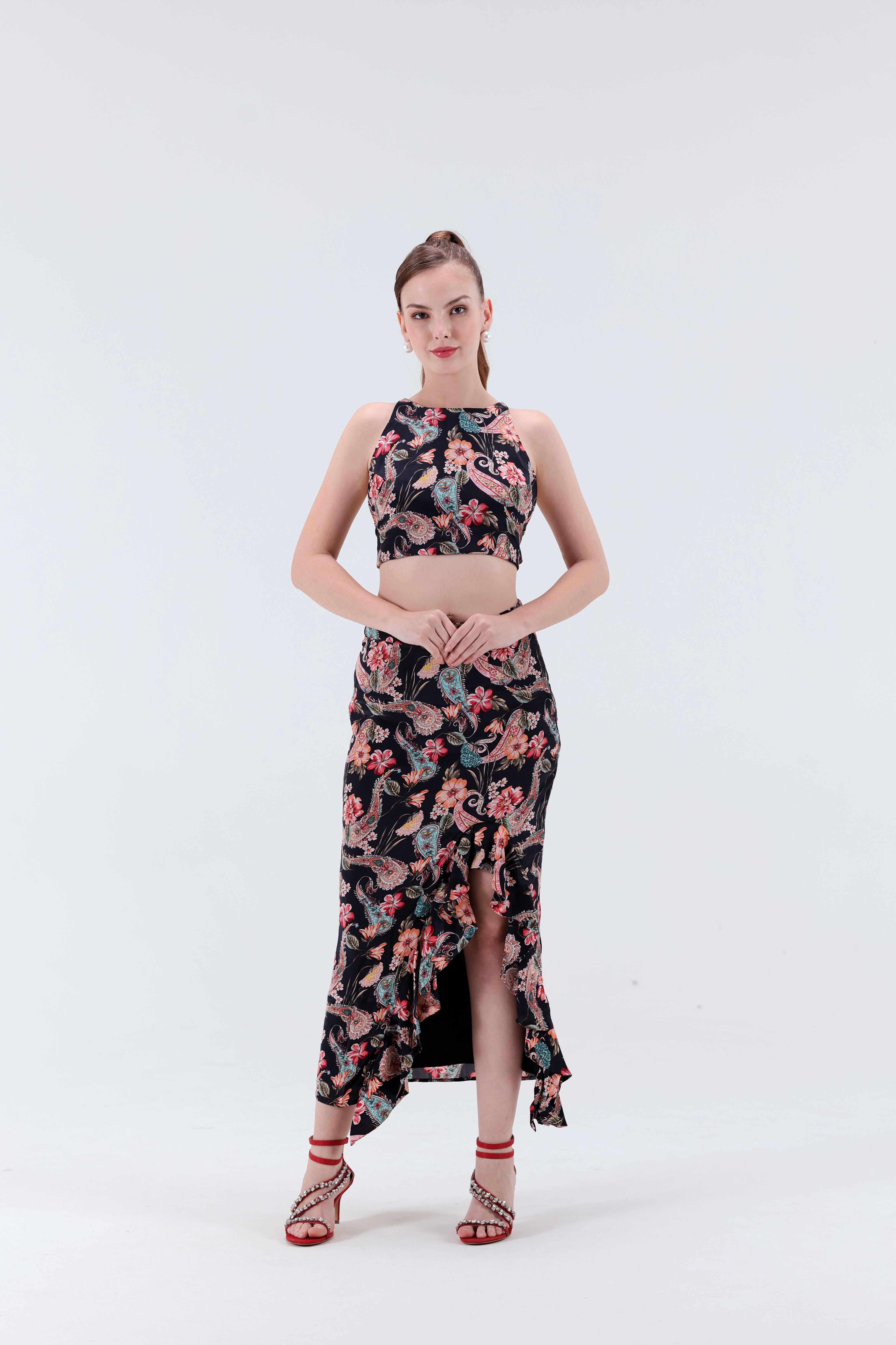 A flowy floral high-waist skirt with ruffle detailing and a slit, adding grace and movement to your look.
