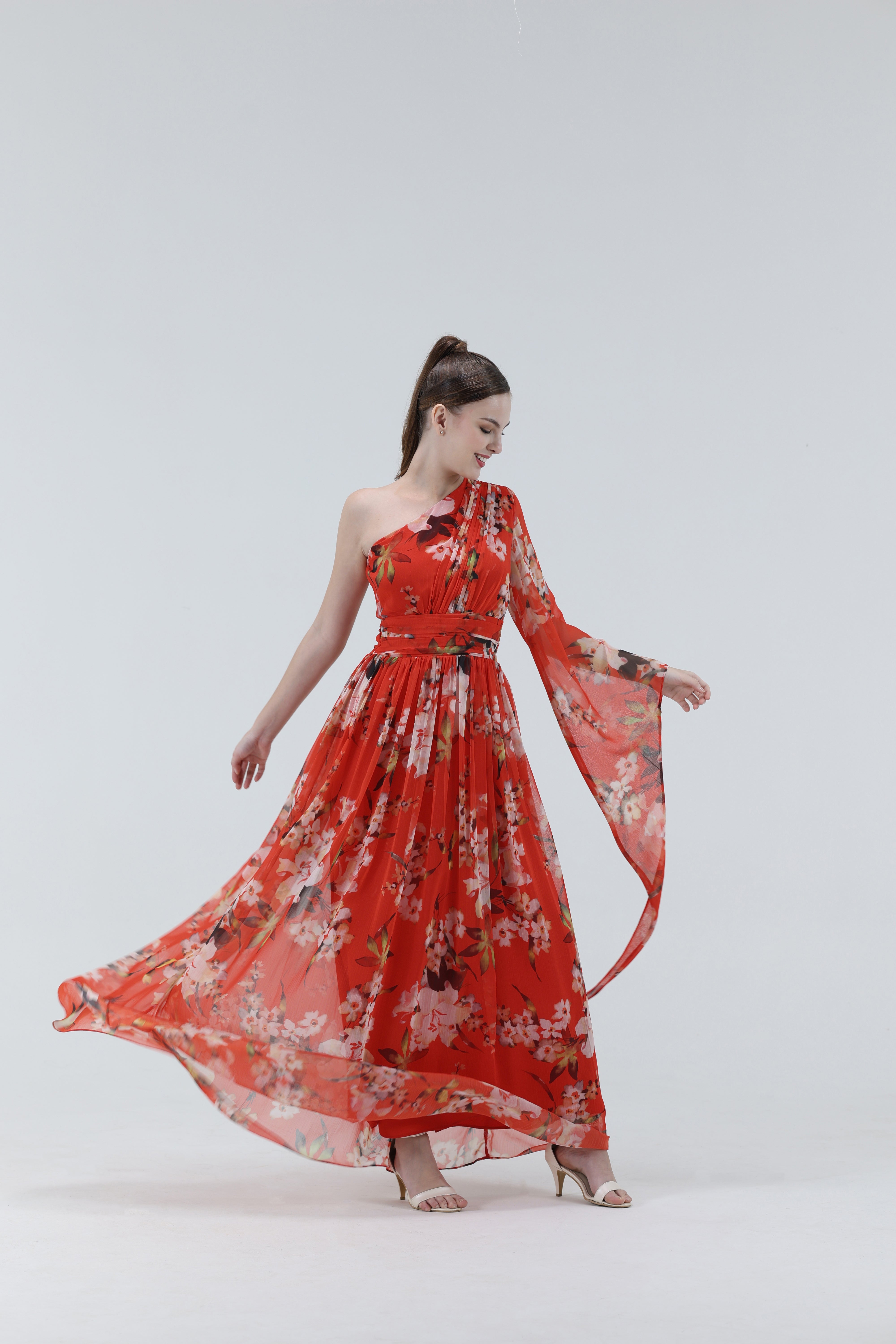 This crimson red with multicolor floral print one-shoulder gown channels the spirit of springtime blossoms with its flowing floral chiffon and sculpted, asymmetrical silhouette. Featuring a single draped sleeve that cascades like a petal in motion, this gown creates a harmonious balance between structure and fluidity.