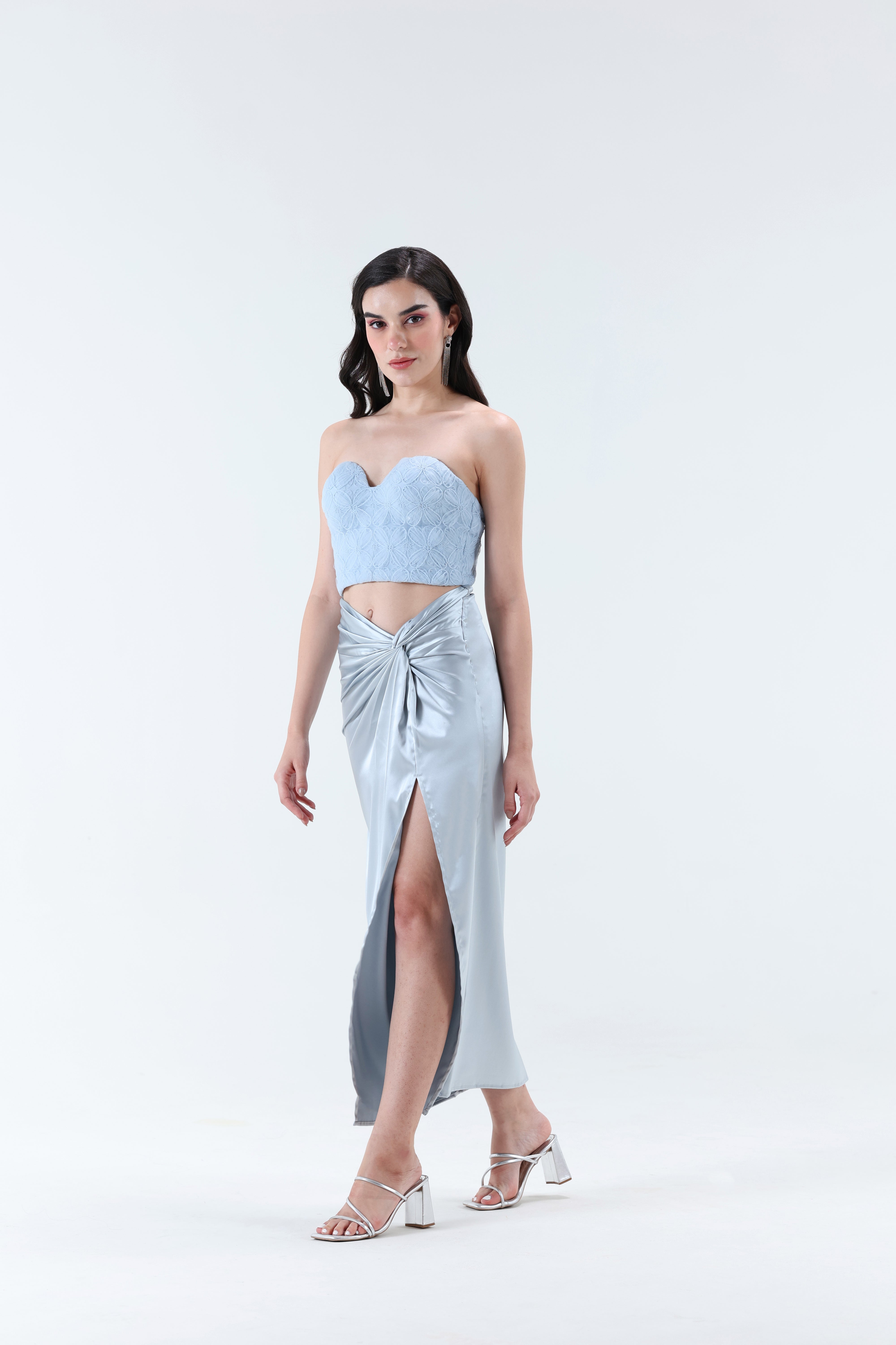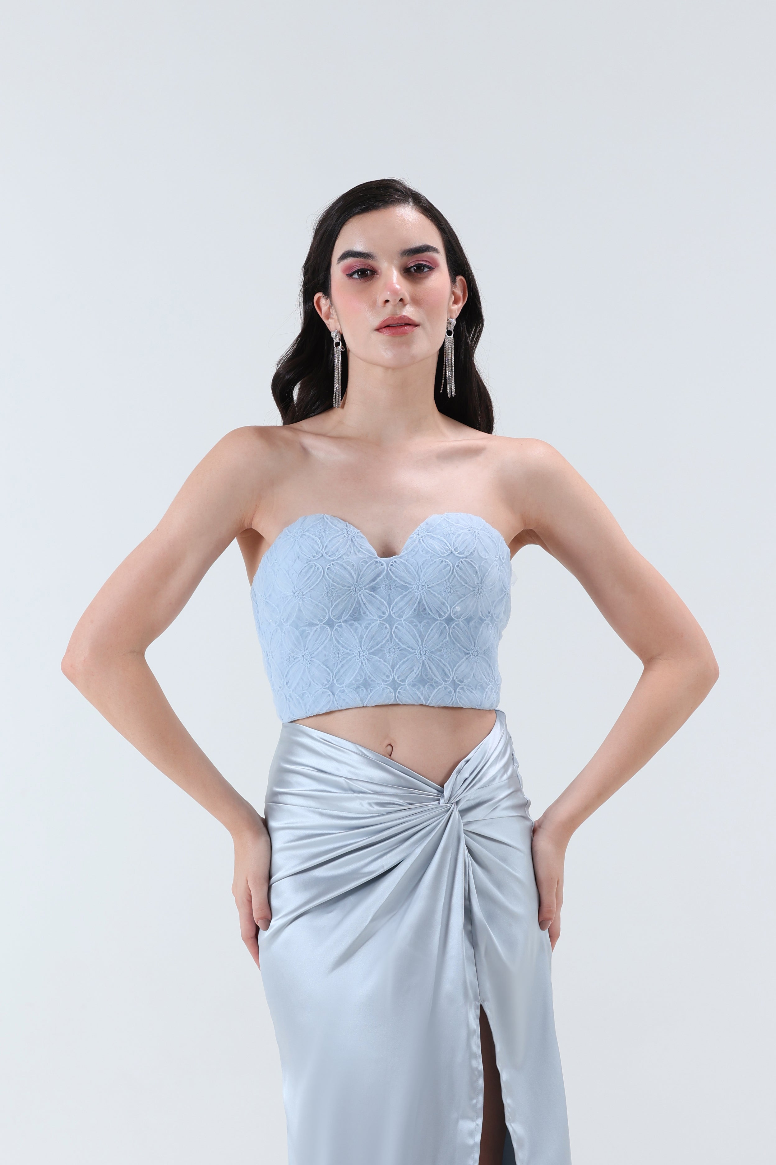 A blend of elegance and structure, this lace organza corset top embodies luxury and sophistication. Its delicate fabric and structured fit make it a standout piece for confident styling.