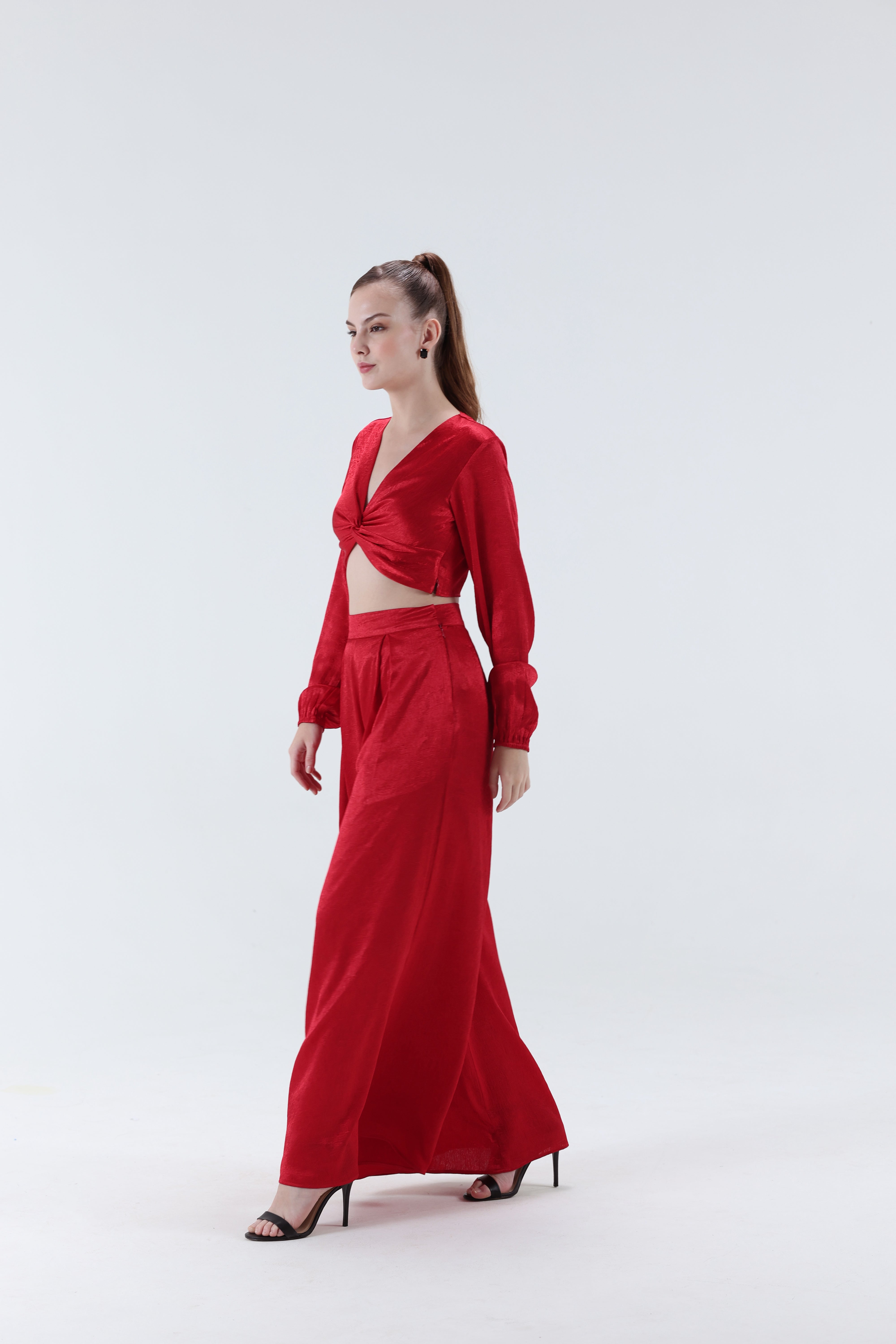 High-waisted wide-leg palazzo pants in red shimmery satin fabric. Tailored with structured front pleats that add graceful movement and volume, these pants create a statement flowy silhouette. Practical side pockets make the design versatile while maintaining elegance.
