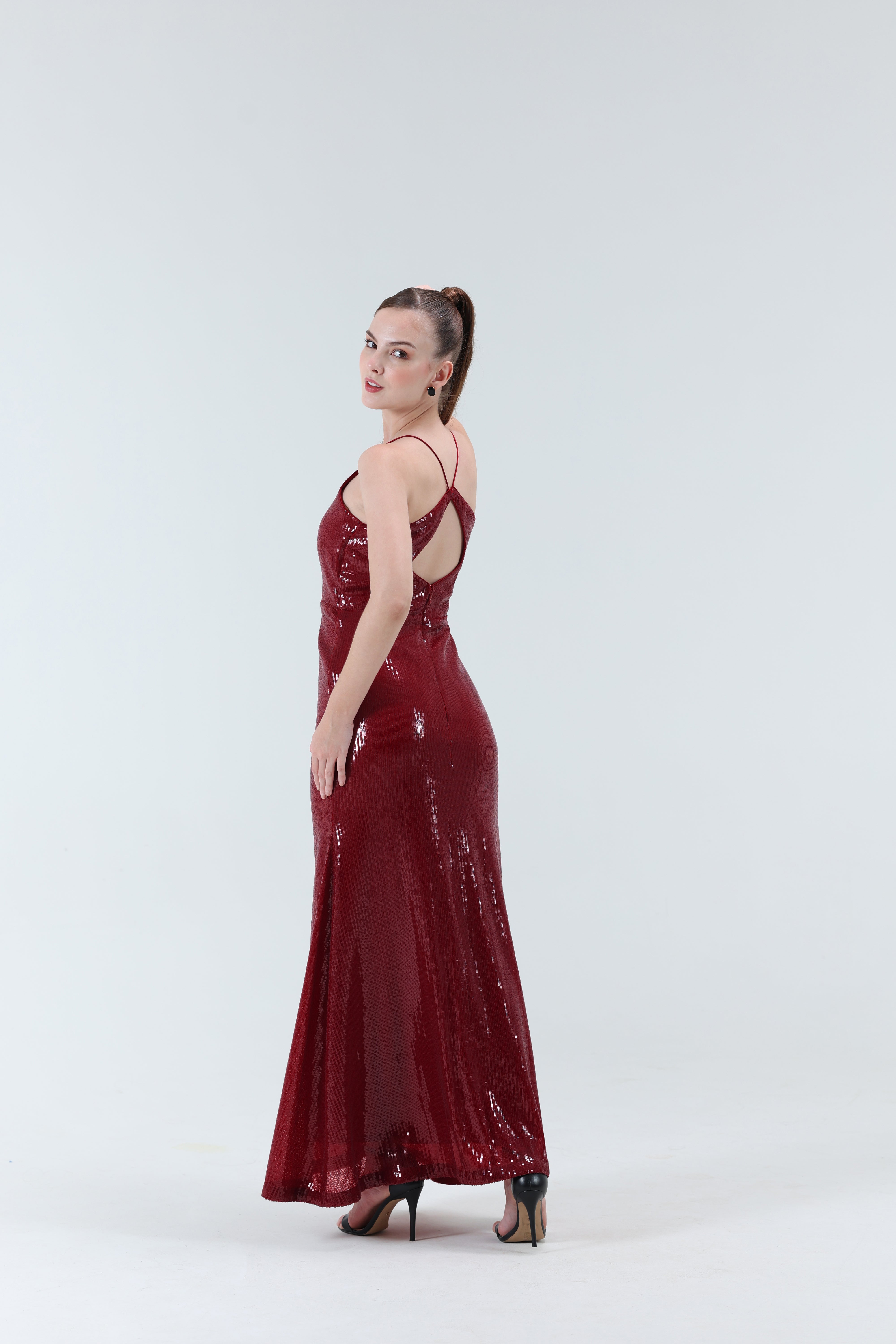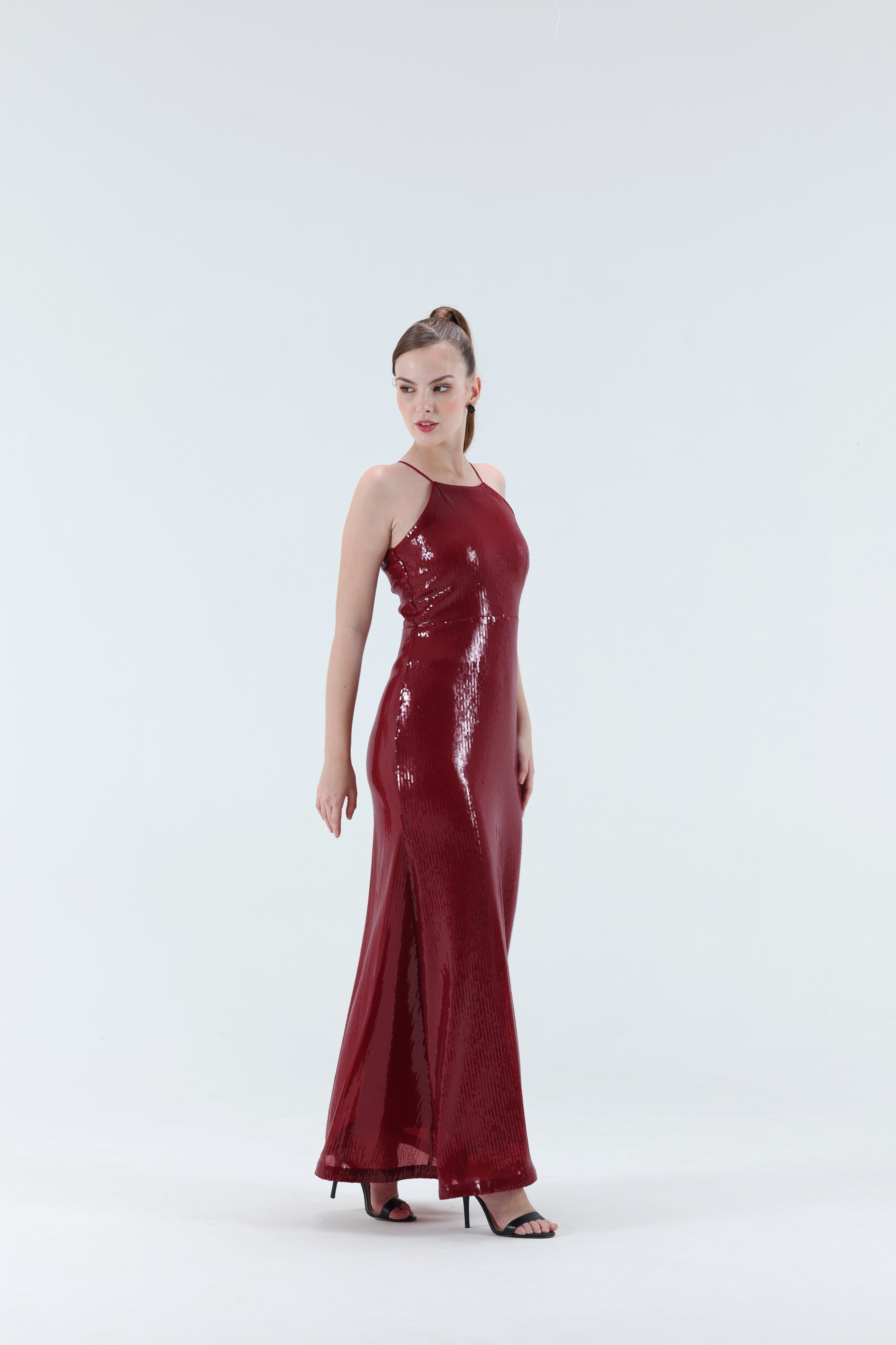 Make a dazzling entrance in this maroon sequin maxi dress, designed to flatter the figure with its curve-enhancing silhouette and striking back detail. A perfect blend of elegance and glamour, this dress is made for nights that demand all eyes on you.